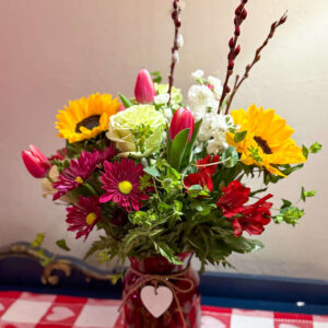 Spring blossoms are often used to convey a sense of hope and renewal. Filled in our newest red-designed, milkjug, this Valentine arrangement brings a sense of optimism and positivity, and features sunflowers, stock, ‘Lemonade’ roses, tulips, daisies, alstroemeria, bupleurum, and pussy willow. The pussy willow branches can be rooted and planted in the spring for the start of a beautiful shub if desired. What a ‘fresh’ way to send out winter and welcome the beauty of spring!