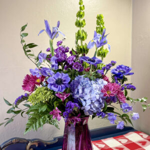 With its origins tied to royalty and ceremony, purple flowers represent dignity, pride and success. This arrangement shows off gorgeous purple and green hydrangea, anemones, sweet pea, spray stock, alstroemeria, Bells of Ireland, daisies, and statice with coordinating greens, and a purple, octagonal-shaped vase. Valentine’s Day is one of the chances the sender gets to really show off the PASSIONS he/she will communicate to the individual who receives this fantastic floral piece!