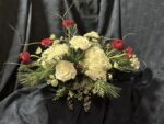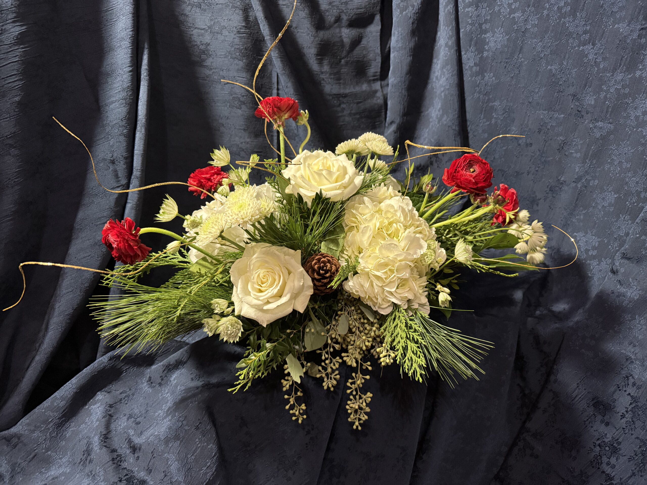The recipient of this arrangement will feel ‘cultured’, as pearls during this season represent beauty and calmness. This dual creation can be displayed as a set or individually, and either way will showcase the frosted vases, accented with a ribbon featuring a small pine cone and berry for added flair. The seasonal greens start with added flowers of red ranunculus, white spray roses, and red and white carnations with green button mums with added birch and red berries for accent.