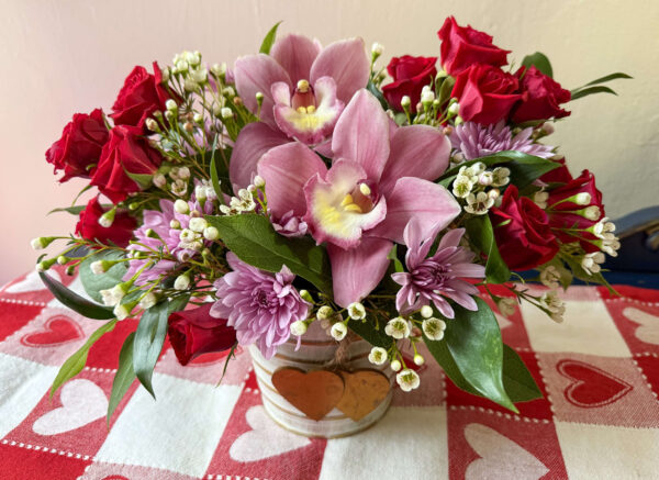 This feature is crafted from a lovely white-wash tin with gold accents and two attached hearts. This adorable arrangement is accented with red spray roses, lavender cushion poms and white wax flower with greens of salal and Italian ruscus, and the two focal, pink cymbidium orchids will have the recipient’s heart a-flutter with the connection of refined strength and beauty that the orchid commuicates!!