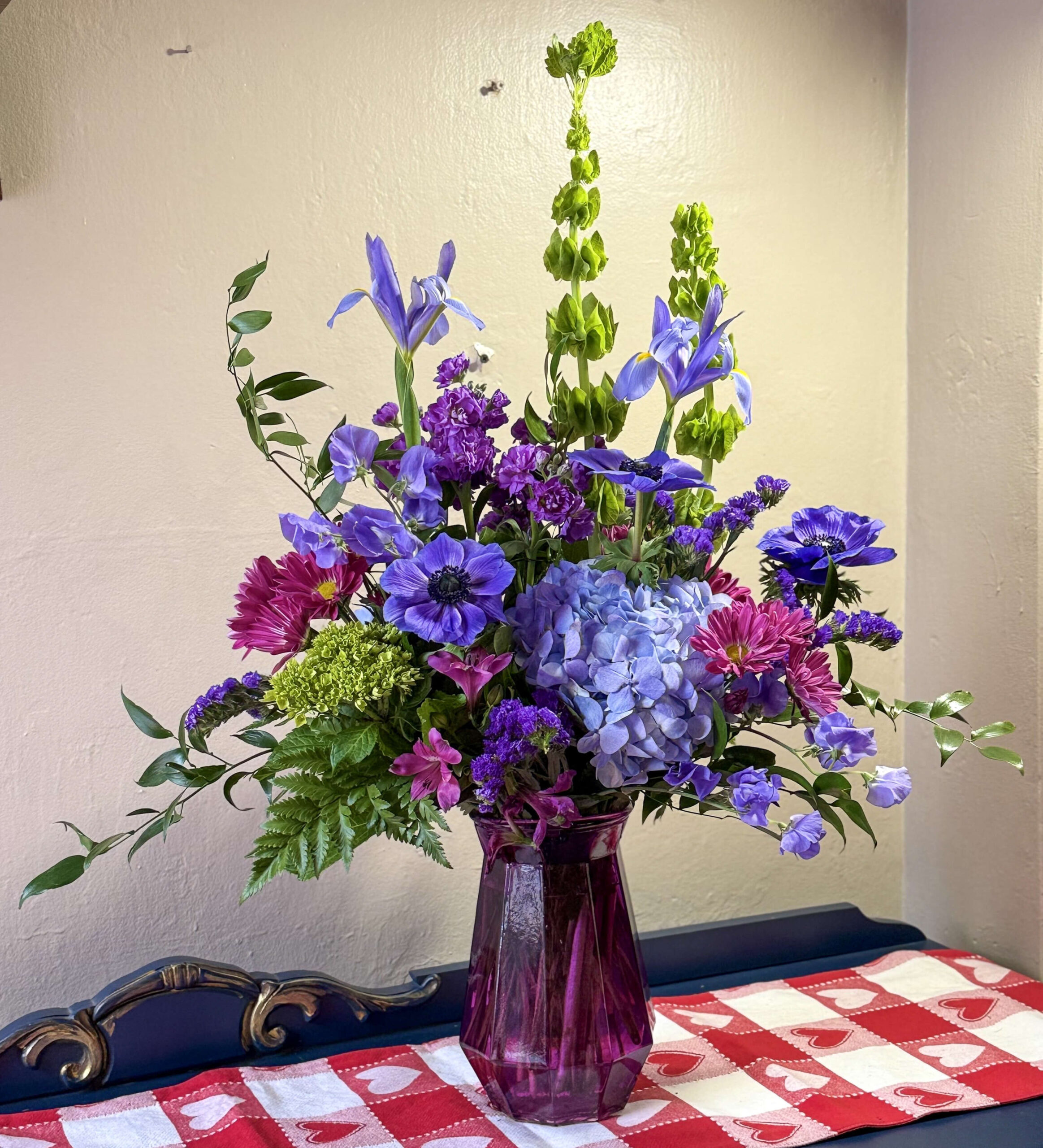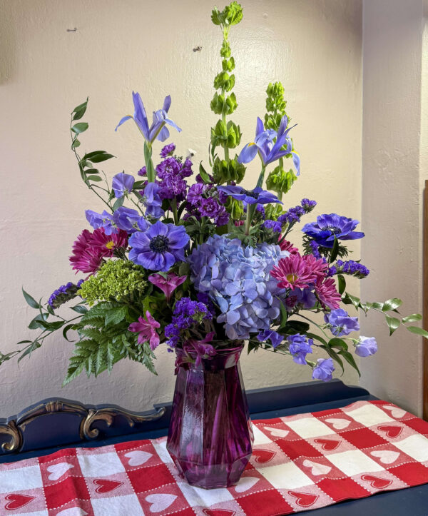 With its origins tied to royalty and ceremony, purple flowers represent dignity, pride and success. This arrangement shows off gorgeous purple and green hydrangea, anemones, sweet pea, spray stock, alstroemeria, Bells of Ireland, daisies, and statice with coordinating greens, and a purple, octagonal-shaped vase. Valentine’s Day is one of the chances the sender gets to really show off the PASSIONS he/she will communicate to the individual who receives this fantastic floral piece!